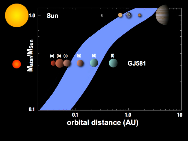 Le système Gliese 581 était déjà connu pour abriter 4 planètes (b, c, d, et e) (Bonfils et al., 2005; Udry et al. 2007 ; Mayor et al., 2009). Ces planètes avaient été révélées par la méthode des vitesses radiales gâce au spectrographe HARPS. En particulier la planète ‘d’, dont la masse minimale étaient estimée en 2009 à 7 MTerre (masses terrestres) se trouve à l’intérieur de la zone habitable, c’est à dire que la planète reçoit suffisamment d’insolation de son étoile pour que de l’eau liquide puisse être présente à sa surface (Selsis et al., 2007, Wordsworth et al., 2010, von Paris et al., 2010).